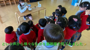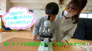 「楽しかった!」との声が多く聞かれ、顕微鏡の活動をとても楽しんでいた様子ですので、今度は子どもたちが顕微鏡で見てみたいものを持ってきてもらい、みんなで見てみたいと思います。