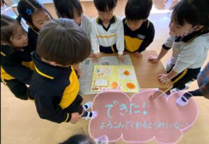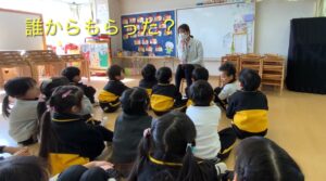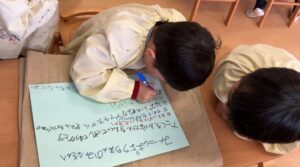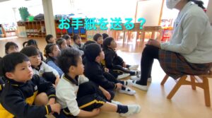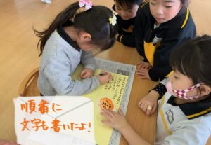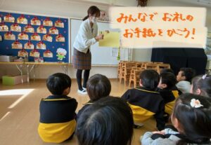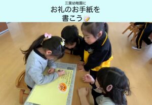 いよかんを食べて、「三葉幼稚園のお友だちに“ありがとう”って伝えたい!」と話していた子ども達!どうやって、なんて伝えようかを考えました。たくさんの意見も出て、お礼の手紙が完成しました!