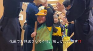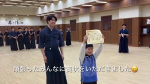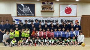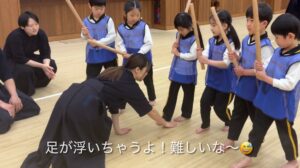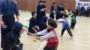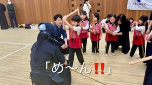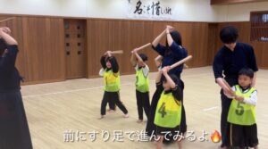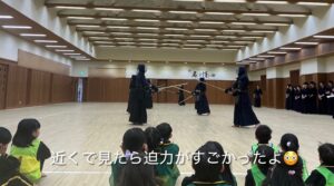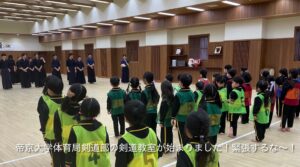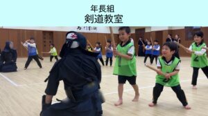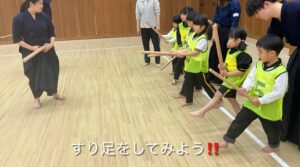 2月に帝京大学体育局剣道部のお兄さんお姉さんに剣道を教えていただきました。動画で見ていた剣道を今日は“本物”で体験!竹刀や防具を間近で見て「わあ〜!」「カッコいい!」と大盛り上がりでした。構え・すり足・面打ちにも挑戦し、「め〜ん!」「どう〜」「こて!」と元気な声!子どもたちの元気な声が剣道場いっぱいに広がりました。