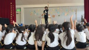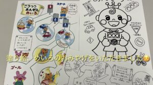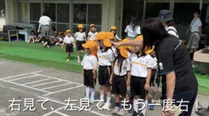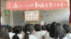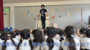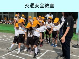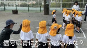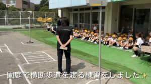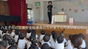 9月に八王子市の交通安全指導員の方に来ていただき、交通安全教室を行いました。信号機の見方や横断歩道の渡り方なども教えてもらいました。