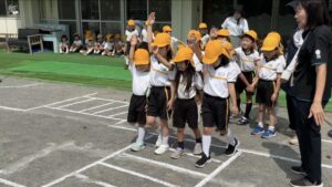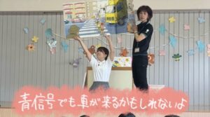 年中さん年長さんは、そのあと園庭で横断歩道を渡る練習をしました。信号は何色かな、しっかり確認してから右手をあげて渡ります。