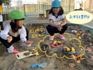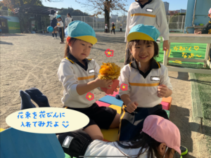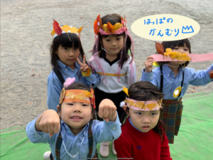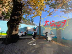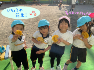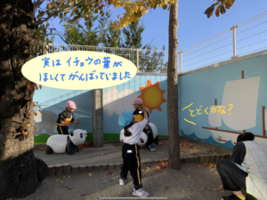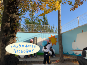 イチョウの木の下でジャンプをしているお友達を発見!なにをしているのか尋ねてみると、「イチョウの葉っぱを取ろうとしてるの」と教えてくれました。年長さんたちがイチョウの葉っぱを使って花束を作っているのを見て、羨ましく思ったそうです。そのあとは年長さんのお姉さんに一緒に探してもらって無事イチョウの花束を作ることが出来ました。落ち葉は子どもたちの手にかかるとお料理になったり、花束になったり、冠や腕輪を作る子もいました。
